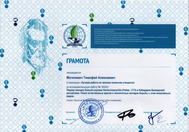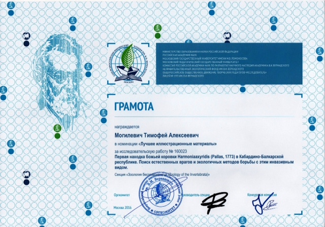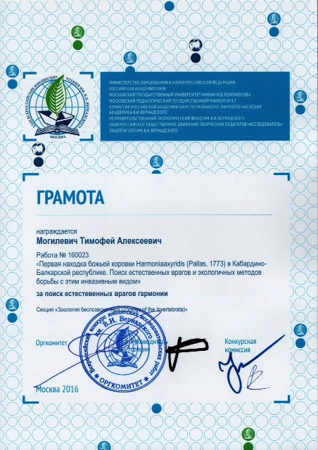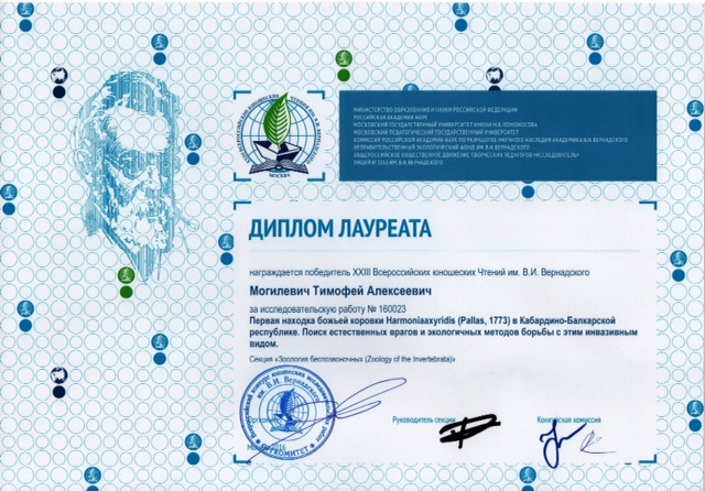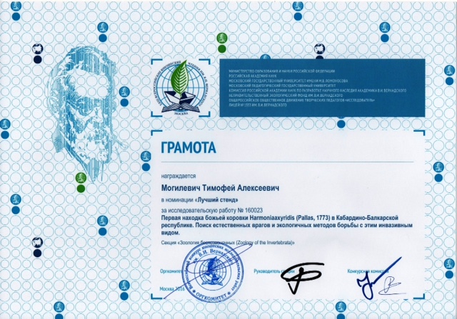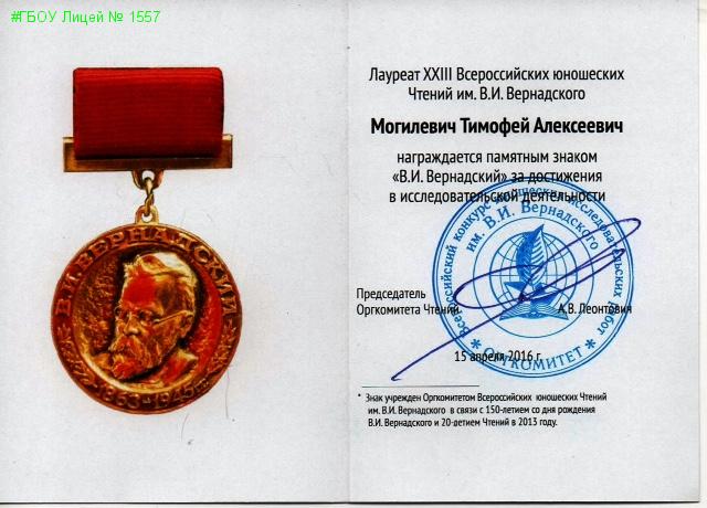 Тимофей Могилевич, ученик 7а класса нашего лицея (корпус 509) стал победителем этого всероссийского открытого конкурса юношеских исследовательских работ, награждён памятным знаком "В.И. Вернадский" за достижения в исследовательской деятельности, несколькими грамотами в различных номинациях и дипломом победителя!