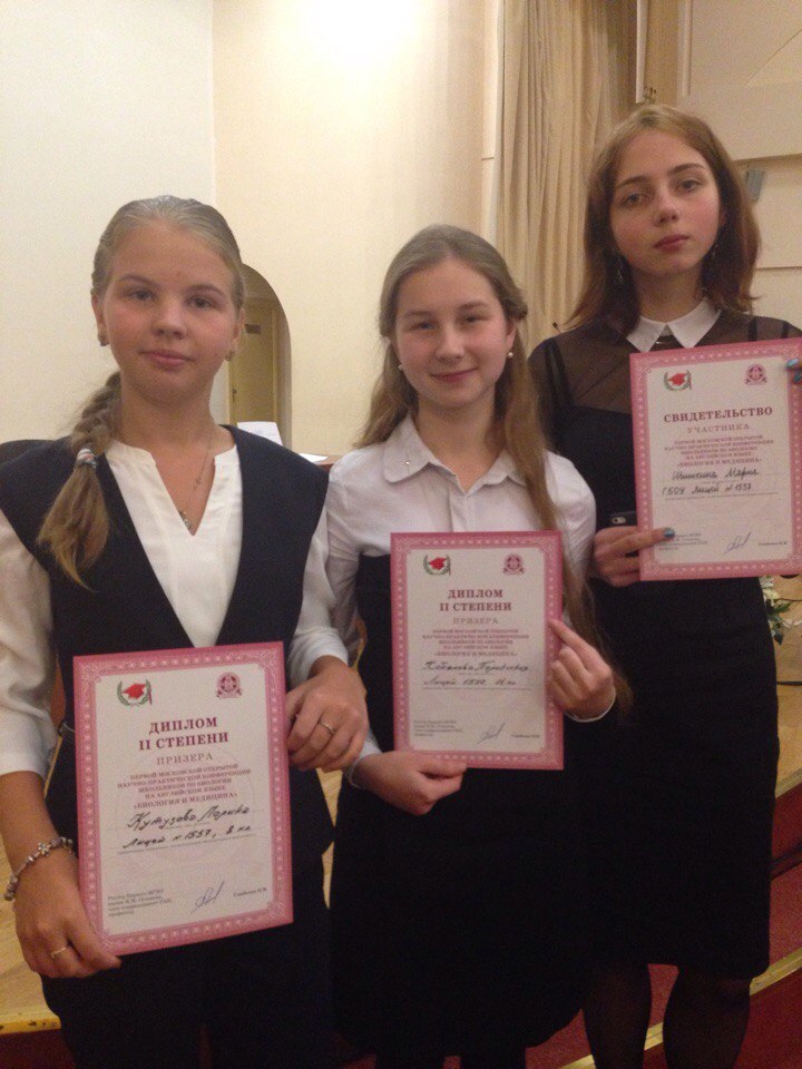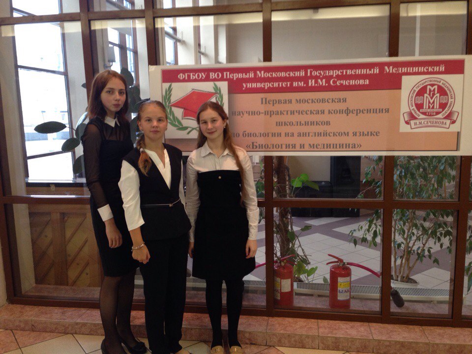 Ученица 8ж класса П. Кутузова и ученица 11ж класса П. Хабалова, которые 29 октября 2016 года приняли участие в Первой научно-практической конференции "Биология и медицина" на английском языке на базе Первого Московского государственного медицинского университета имени И.М. Сеченова, стали призёрами и награждены дипломами второй степени! М. Шишкина получила диплом участника конференции.