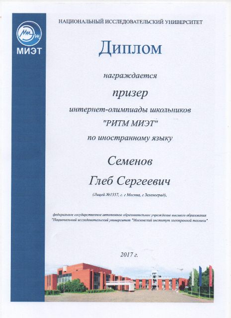 Десятиклассник Глеб Семёнов стал призёром интернет-олимпиады школьников "Ритм-МИЭТ"
