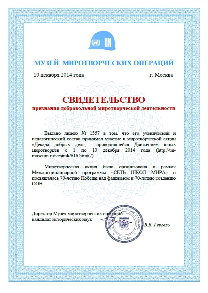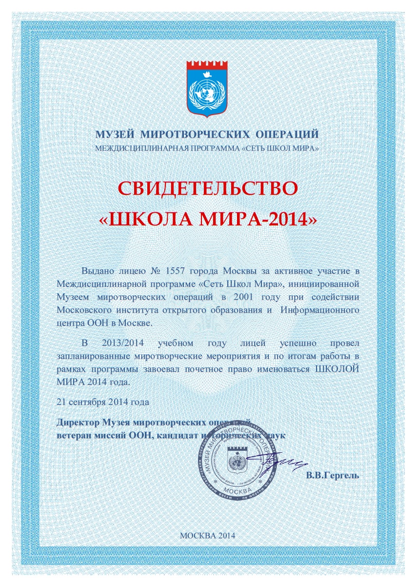 Лицей 1557завоевал право носить почетное звание "Школа Мира-2014"!