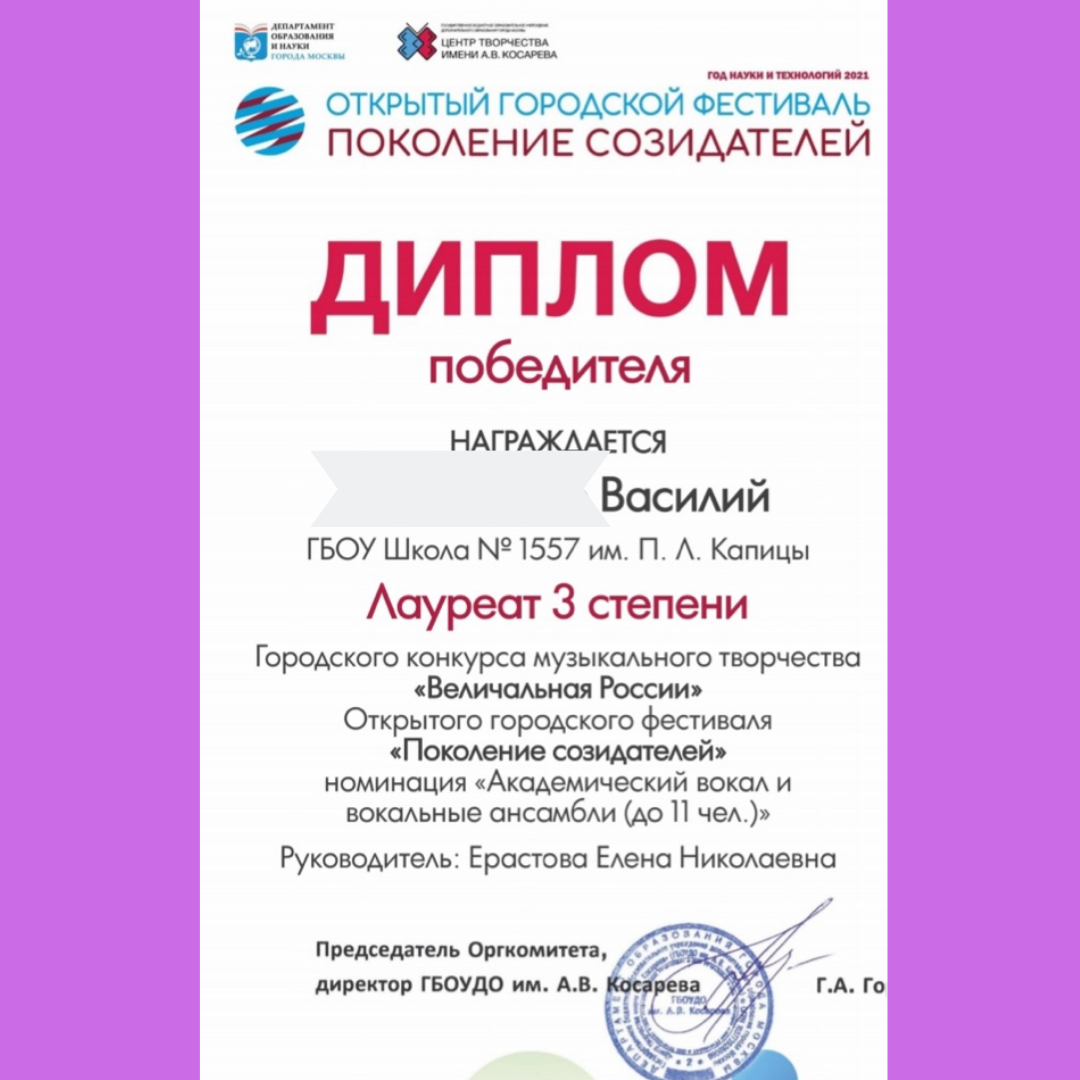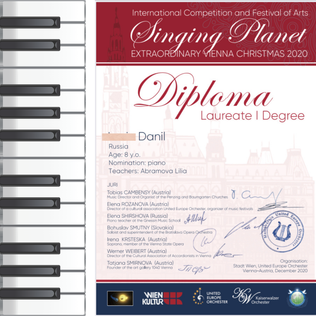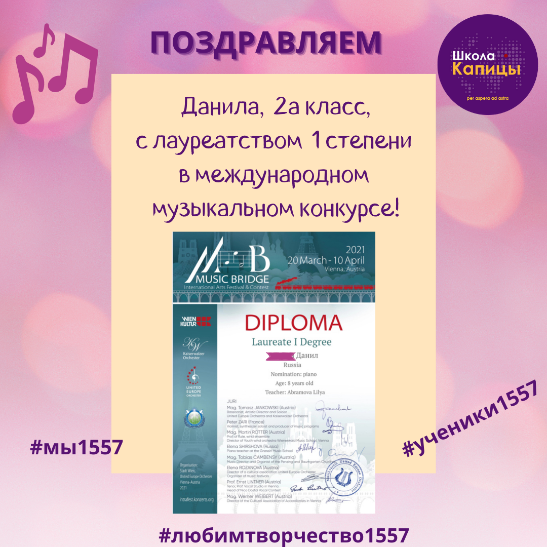 Поздравляем Данила, 2а класс - лауреата 1 степени Международного Венского фестиваля!